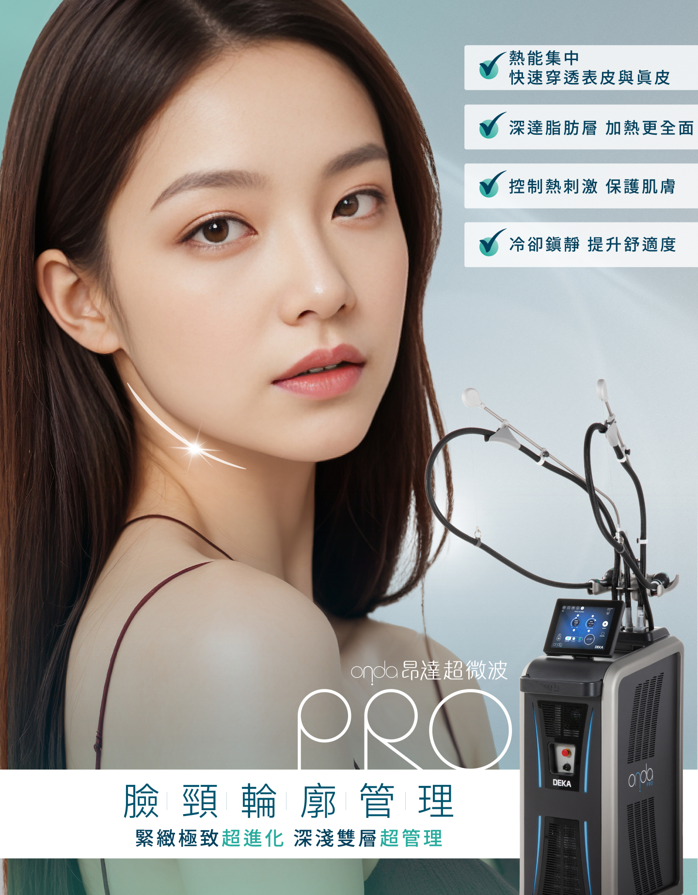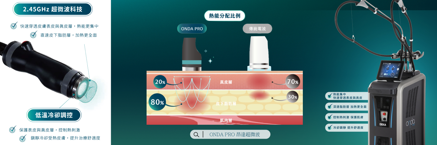Onda Pro 昂達超微波,來自義大利的專業技術,榮獲美國 FDA、歐盟 CE、台灣 TFDA、韓國 MFDS 多重認證。以獨家 Coolwaves 微波科技,採用 2.45GHz 超高頻率,能深入皮下 0.7-1.2cm,導電效率高達傳統電波的 3.5 至 5 倍。